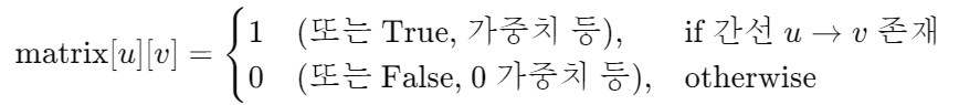 | 장점 | - 특정 간선(u→v) 존재 여부를 O(1)에 확인 - 빠른 조회 |