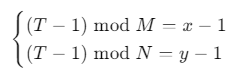 그렇다면 T가 x, x + M, x + 2M, ... 형태로 나열될 것이고, 그 중에서 (T−1) N+1=y를 만족하는지 찾으면 된다.